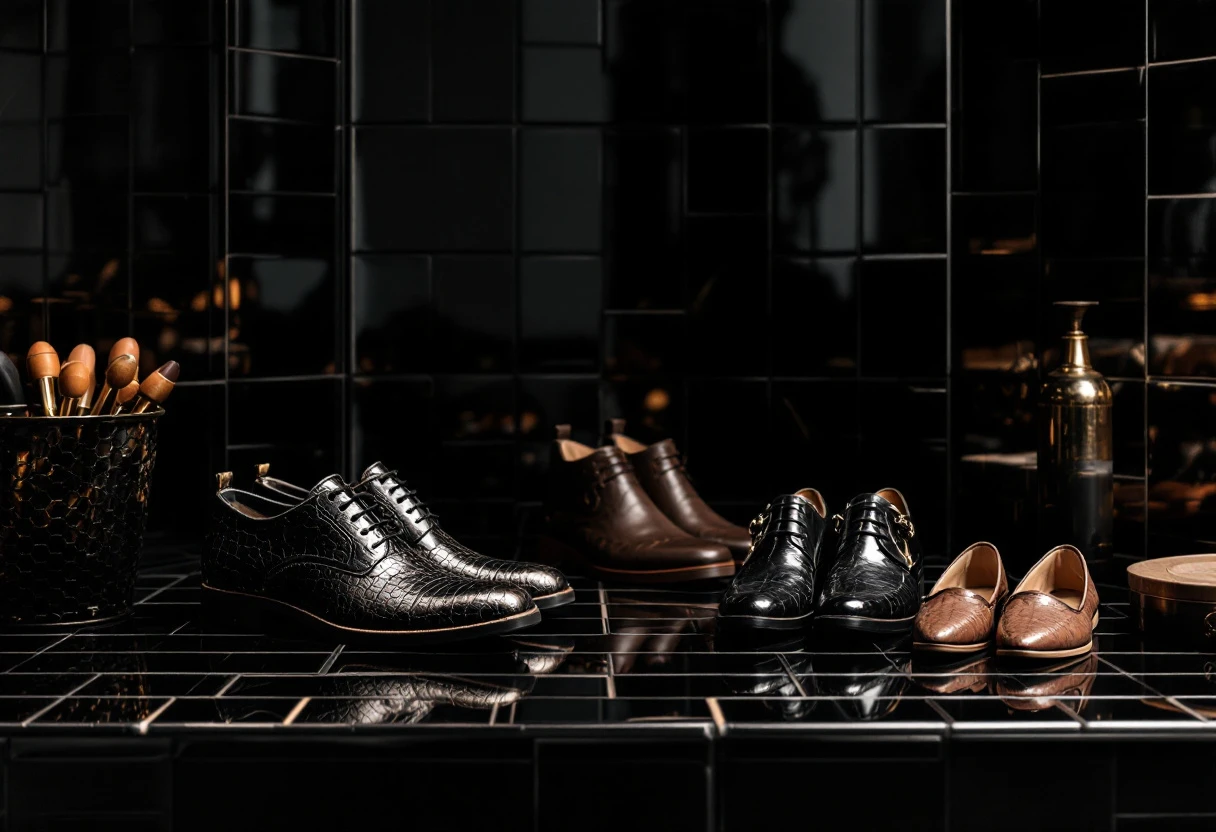 L’ambiance dramatique d’un coin chaussures prend de la profondeur grâce à quelques accessoires bien choisis. Les miroirs graphiques ou aux cadres épurés créent des jeux de lumière tout en agrandissant visuellement l’espace. Ajouter des appliques murales noires ou dorées réchauffe l’atmosphère et fait ressortir la texture du carrelage noir.